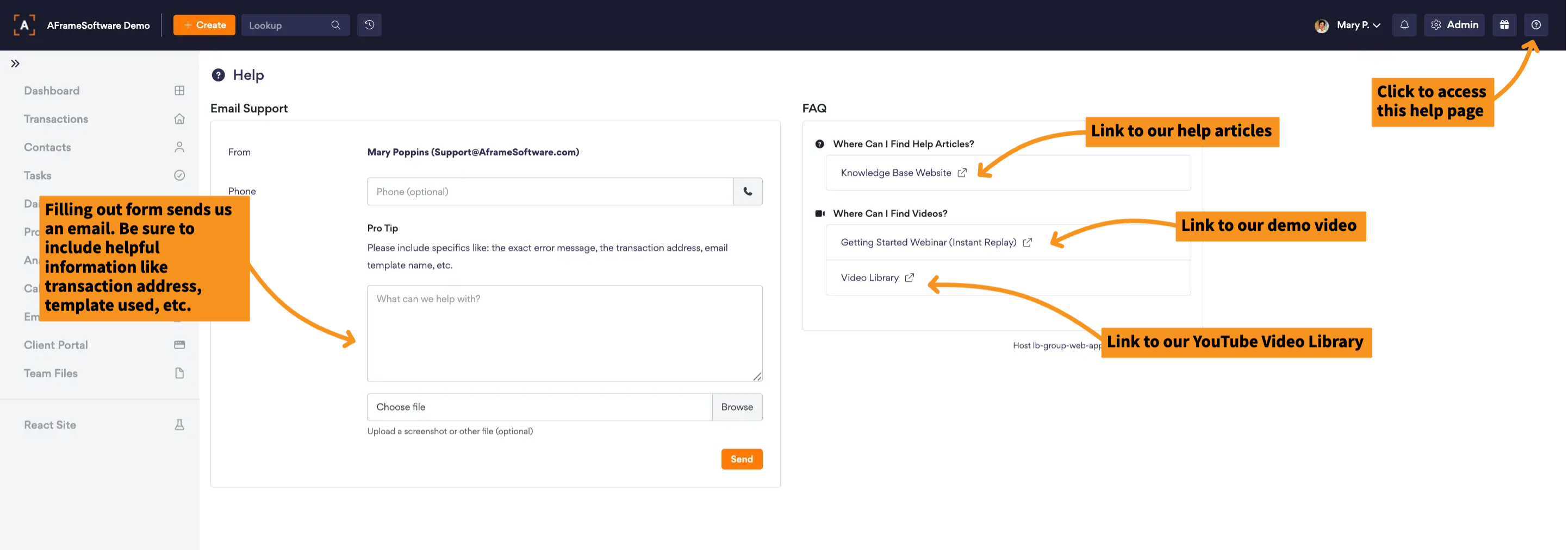Need a quick answer or running into a roadblock? You’ve got options—and they are right at your fingertips under the AFrame Help Page (the ? icon in the top-right corner)!