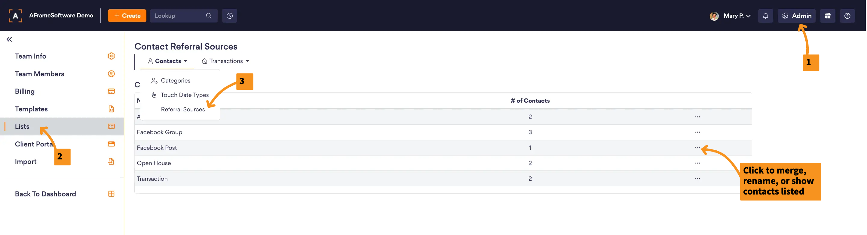 Open in AFrame: Admin → Lists → Contacts → Referral Sources