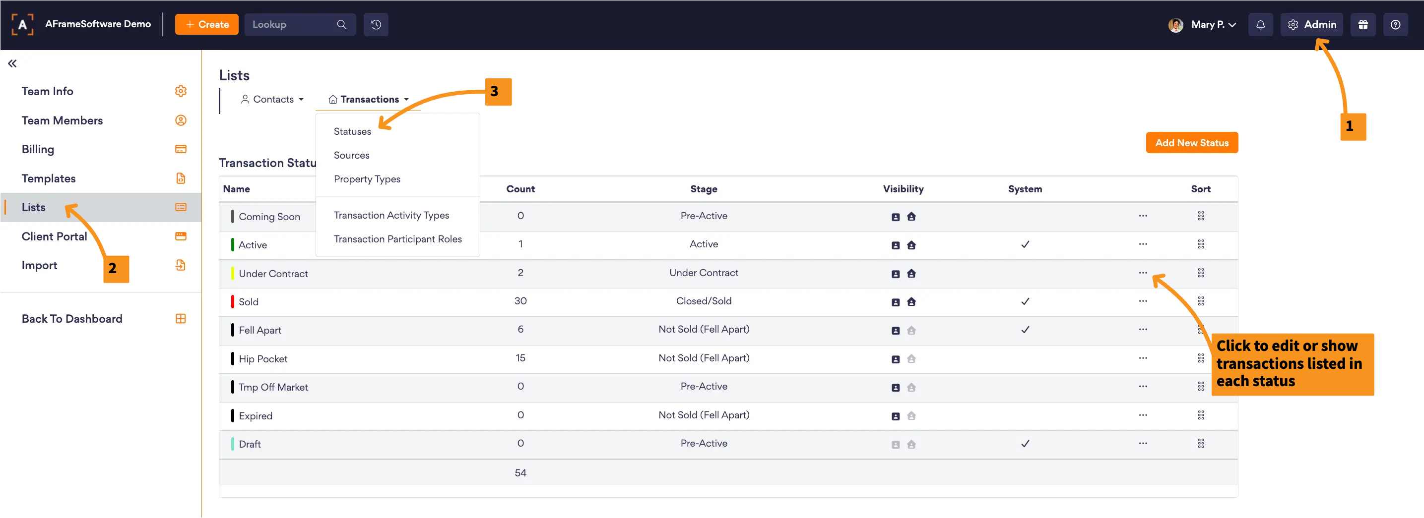 Customizing the default transaction status list allows you to tailor your account to create a list of statuses that best represent your transaction stages. You will have 5 main stages to use to categorize each status: pre-active, active, under contract, closed/sold, & not active. You can also choose the visibility of select statuses within the agent & buyer/seller portals, giving you more control over who sees what. Additionally, at any time, you can pull summary reports for your team or individual agents with the status separated by status.