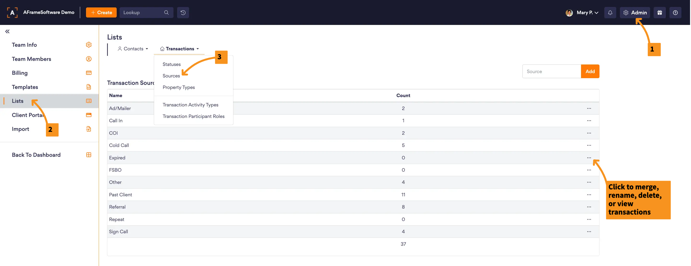 Open in AFrame: Admin → Lists → Transactions → Sources