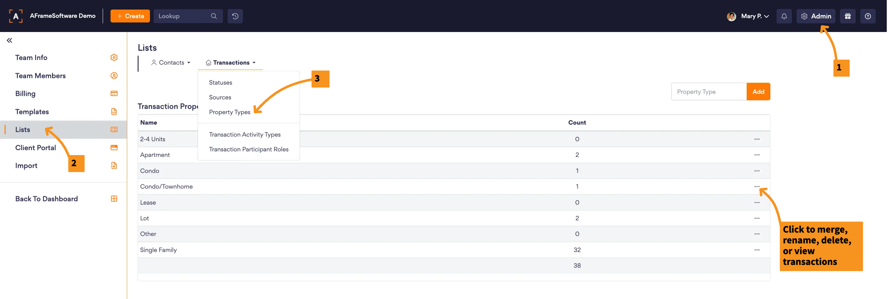 Open in AFrame: Admin → Lists → Transactions → Property Types