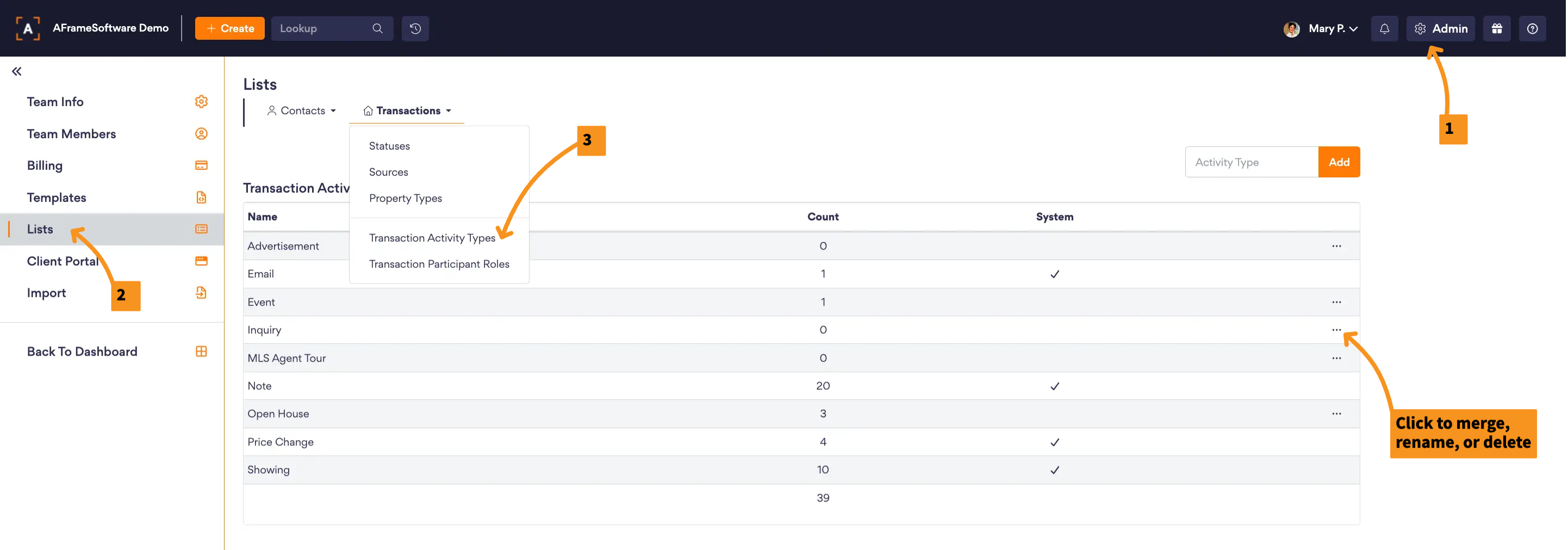 Open in AFrame: Admin → Lists → Transactions → Activity Types