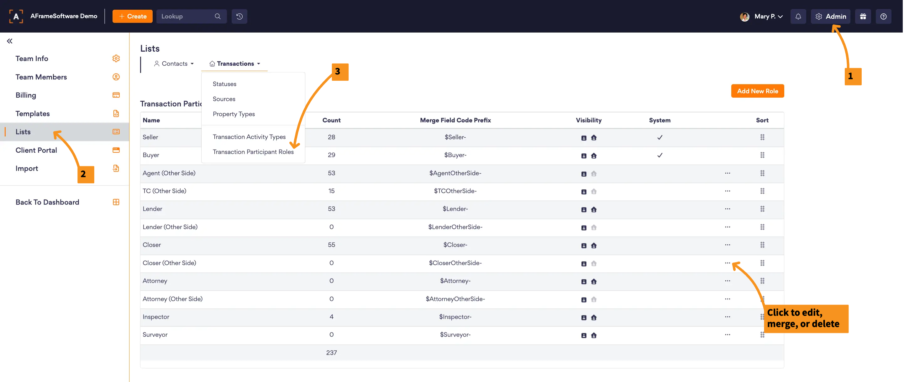Open in AFrame: Admin → Lists → Transactions → Participant Roles