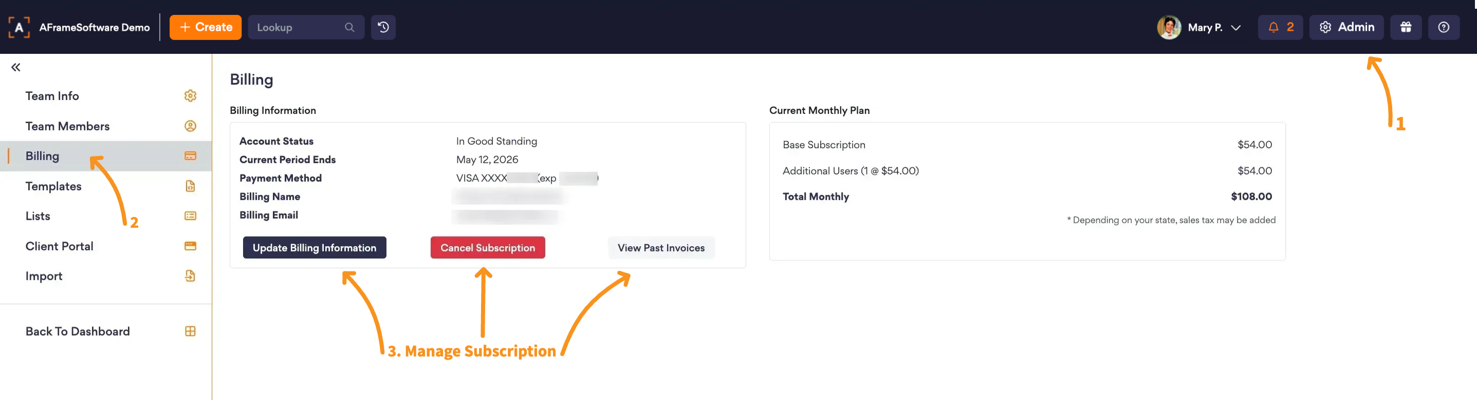 Open in AFrame: Admin → Billing