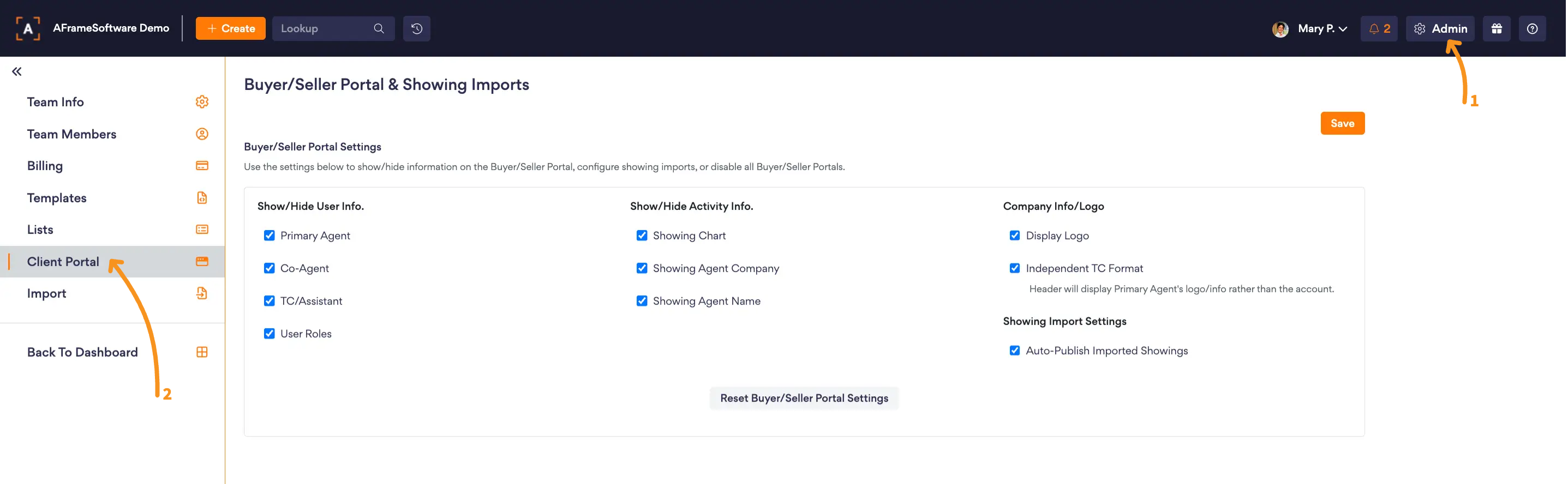 Open in AFrame: Admin → Client Portal